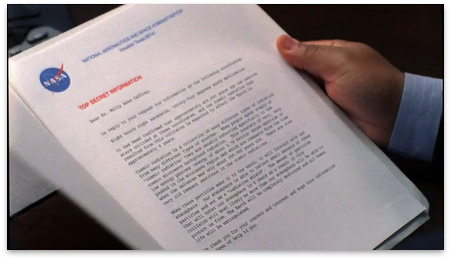 A quick, mildly-spoilery synopsis: aliens are creatively invading Earth, taking over humans and changing our biology to be more like their own. In one episode, the self-appointed leader of the infiltrators tells our protagonists that the aliens’re doing this to save humanity: a stellar phenomenon beyond our casual observation occurred long ago, and it spells the end of humanity unless we’re modified to become hardier (i.e. more like the aliens are making us). It’s a big reveal about halfway through the truncated season, but our heroes don’t take the aliens’ words for it and resolve to verify their claims. In one of the last episodes before cancellation, they receive a memorandum from NASA confirming what the aliens claimed.
